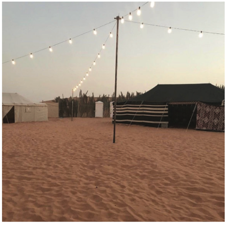 A recreational activity that allows people to use tents woven from hair, wool, polyester or any other materials and are fixed to the ground with ropes and pegs and have poles, and mobile caravans are included in its provisions, without the use of construction materials such as building materials or their equivalent, in the vegetation cover lands, or the lands allocated by the relevant entities for camping activities.
